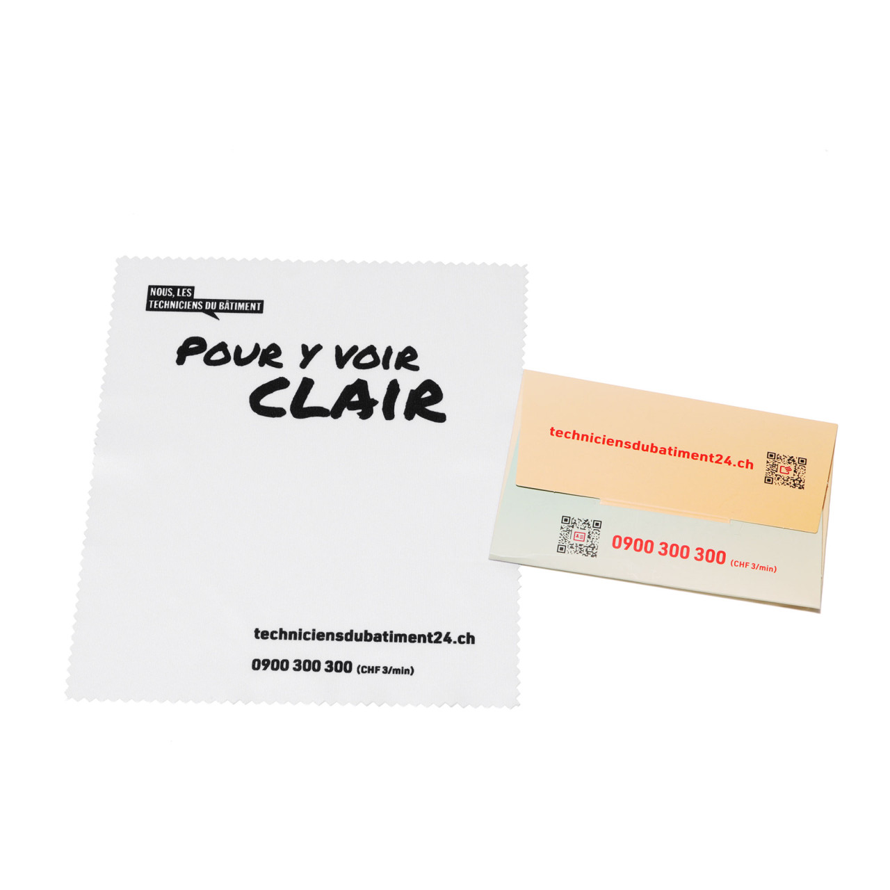 Emballage multicolore « techniciensdubâtiment24.ch », inscription « Votre partenaire en cas d'urgence », Référence au service d'urgence, y compris codes QR vers le site Internet et la hotline